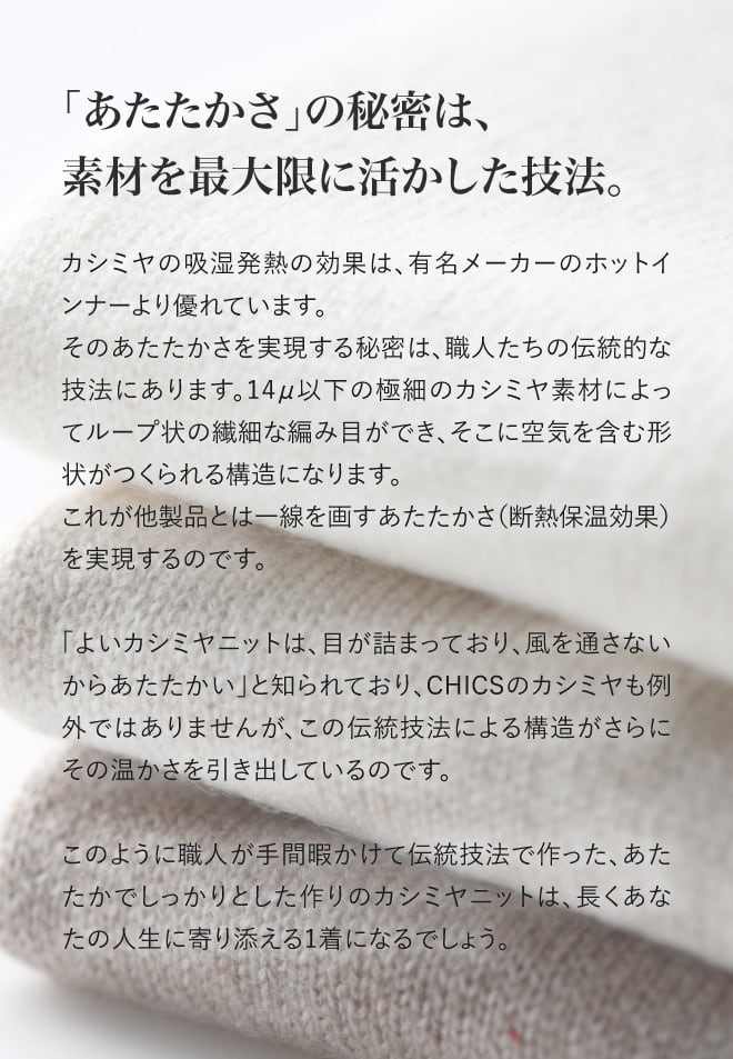 CHICSのカシミヤはお客様からのご注文を受けてから、あなたのために1着ずつ作られます。