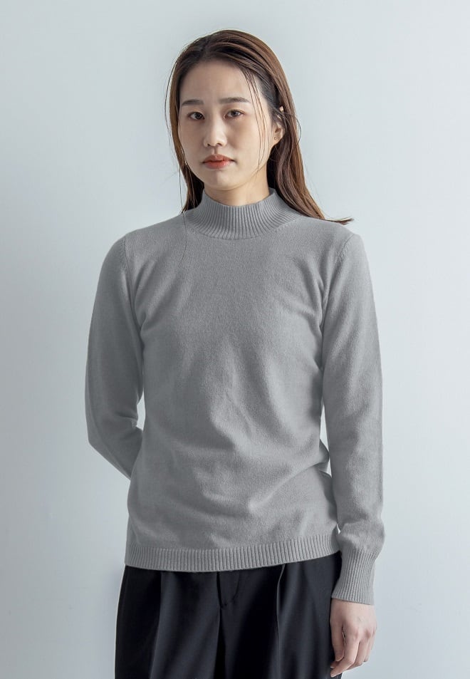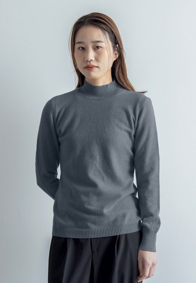 首に沿って綺麗に立ち上がるリブ編みの衿6cmのハイネックプルオーバーです。